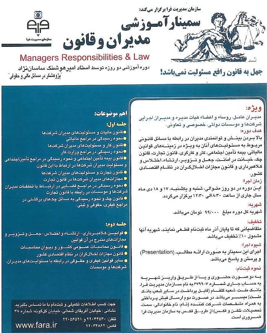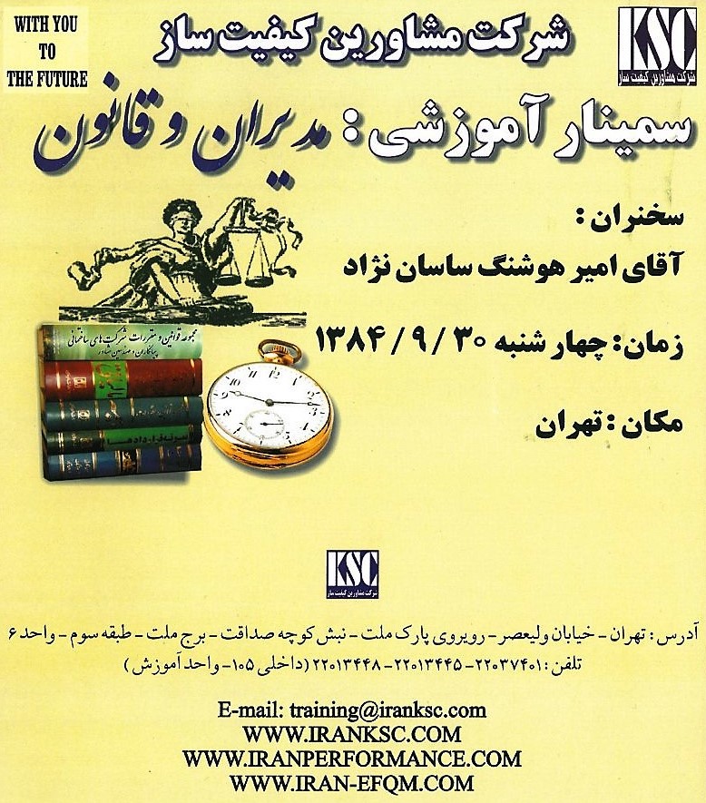 که مطالب بسیار مهمی در رابطه با مسئولیت های قانونی مدیران شرکت ها و موسسات ، در روز چهارشنبه ١٣٨٤/٠٩/٣٠ در سالن آموزش « شركت مشاورين كيفيت ساز » براى تعداد زيادى از مديران شركت ها و موسسات توليدى ، بازرگاني و خدماتي تهران و شهرستان ها برگزار گرديد .